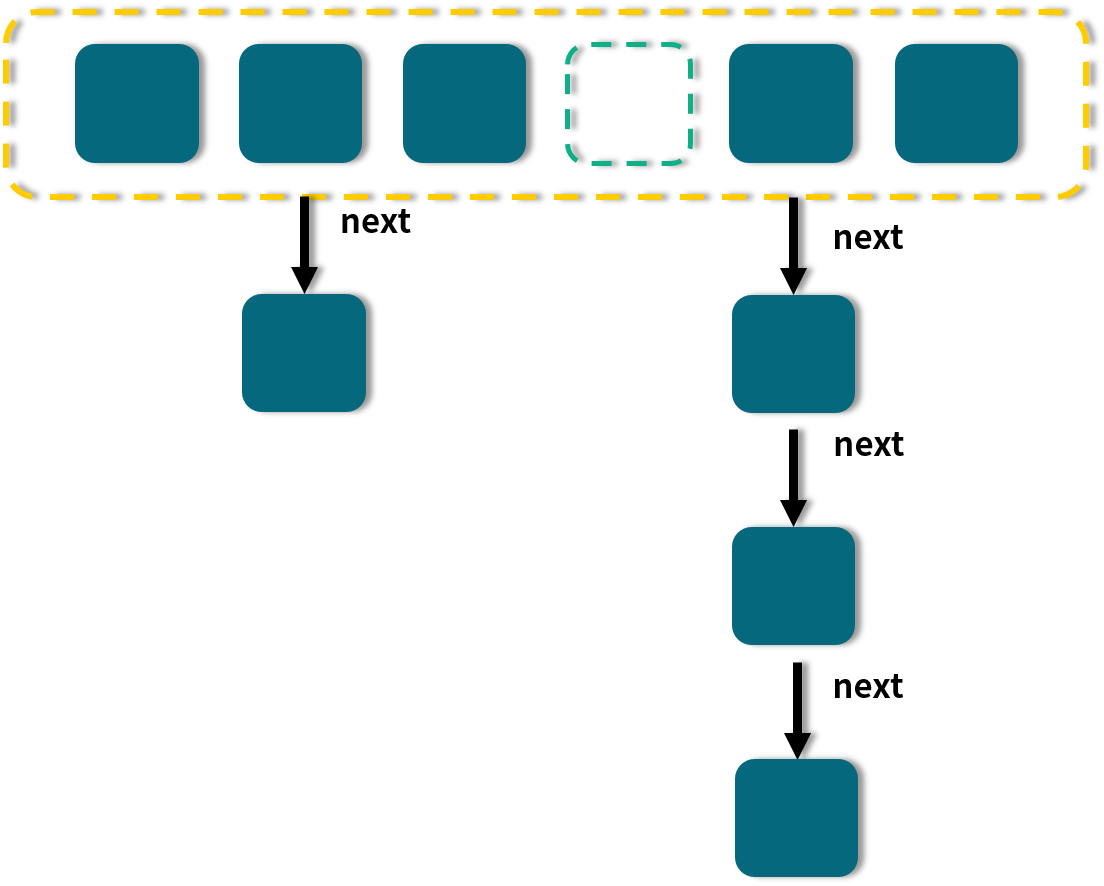 JDK 1.8 的 HashMap 和 ConcurrentHashMap 都有这样一个特点:最开始的 Map 是空的,因为里面没有任何元素,往里放元素时会计算 hash 值,计算之后,第 1 个 value 会首先占用一个桶(也称为槽点)位置,后续如果经过计算发现需要落到同一个桶中,那么便会使用链表的形式往后延长,俗称“拉链法”,如图所示: