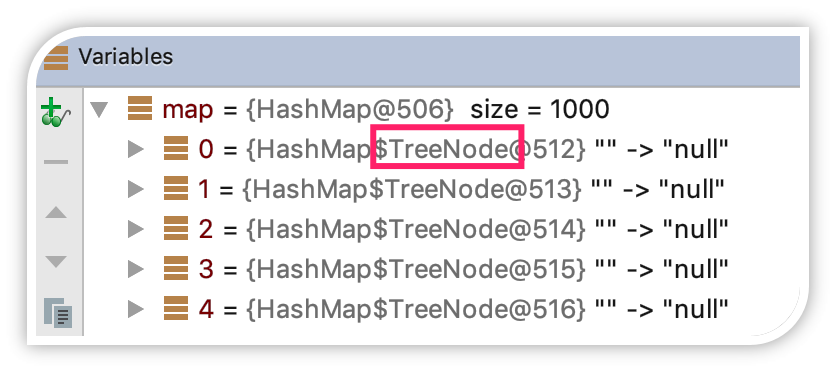 在这个例子中,我们建了一个 HashMap,并且不停地往里放入值,所放入的 key 的对象,它的 hashCode 是被重写过得,并且始终返回 1。这段代码运行时,如果通过 debug 让程序暂停在 System.out.println("运行结束") 这行语句,我们观察 map 内的节点,可以发现已经变成了 TreeNode,而不是通常的 Node,这说明内部已经转为了红黑树。