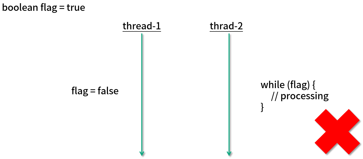 在图中左上角可以看出,有一个公共的 boolean flag 标记位,最开始赋值为 true,然后线程 2 会进入一个 while 循环,并且根据这个 flag 也就是标记位的值来决定是否继续执行或着退出。