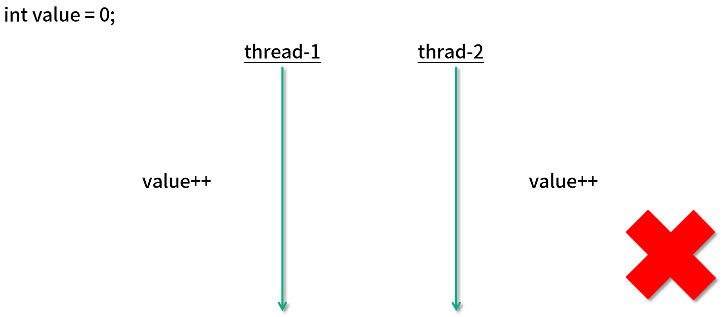现在让我们回顾一下很熟悉的多线程同时进行 value++ 的场景,如图所示: