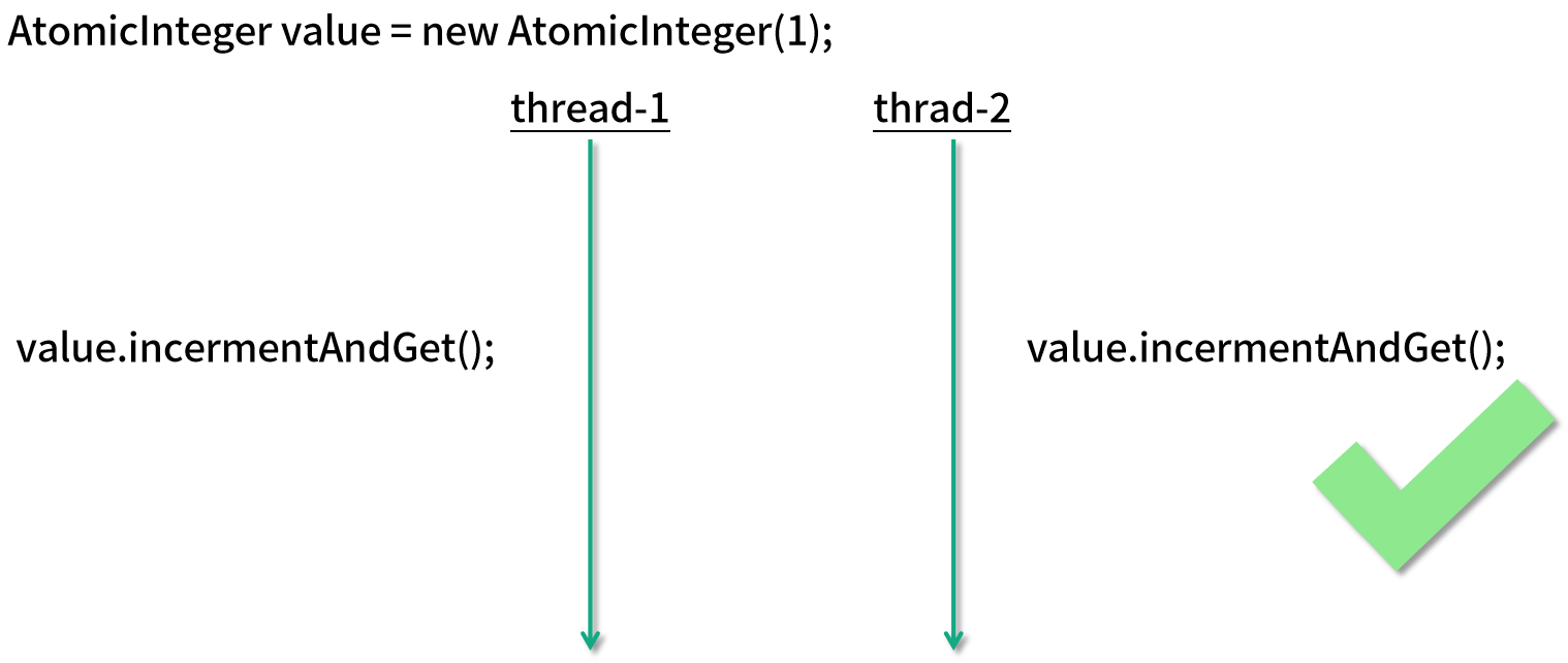 在利用了原子变量之后就无需加锁,我们可以使用它的 incrementAndGet 方法,这个操作底层由 CPU 指令保证原子性,所以即便是多个线程同时运行,也不会发生线程安全问题。原子类和 volatile 的使用场景¶