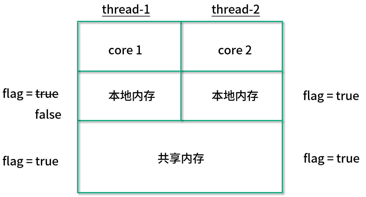 最开始它们都可以读取到 flag 为 true ,不过当线程 1 这个值改为 false 之后,线程 2 并不能及时看到这次修改,因为线程 2 不能直接访问线程 1 的本地内存,这样的问题就是一个非常典型的可见性问题。