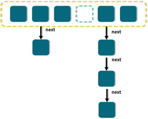 比如其中一个不同点就是,我们知道 HashMap 在面对 hash 冲突的时候,采用的是拉链法。它会先把对象 hash 到一个对应的格子中,如果有冲突就用链表的形式往下链,如下图所示: