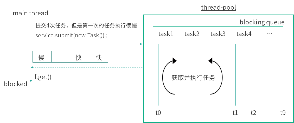 在提交完这 4 个任务之后,我们用 for 循环对它们依次执行 get 方法,来获取它们的执行结果,然后再把这个结果打印出来。