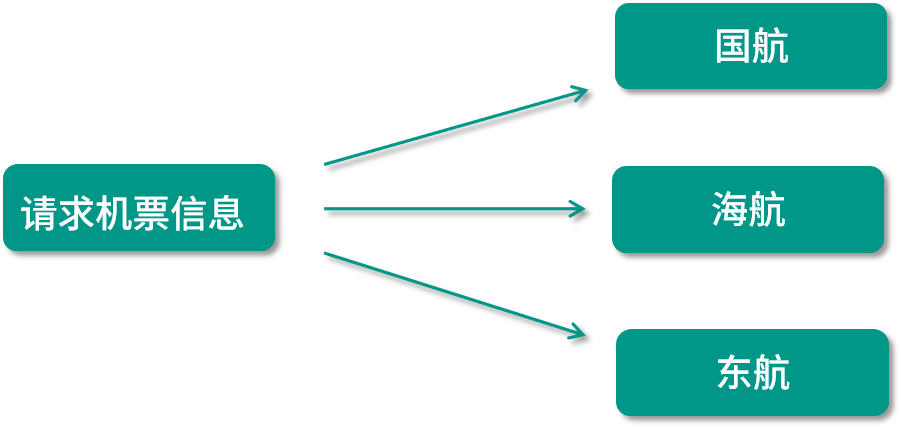 什么是旅游平台问题呢?如果想要搭建一个旅游平台,经常会有这样的需求,那就是用户想同时获取多家航空公司的航班信息。比如,从北京到上海的机票钱是多少?有很多家航空公司都有这样的航班信息,所以应该把所有航空公司的航班、票价等信息都获取到,然后再聚合。由于每个航空公司都有自己的服务器,所以分别去请求它们的服务器就可以了,比如请求国航、海航、东航等,如下图所示: