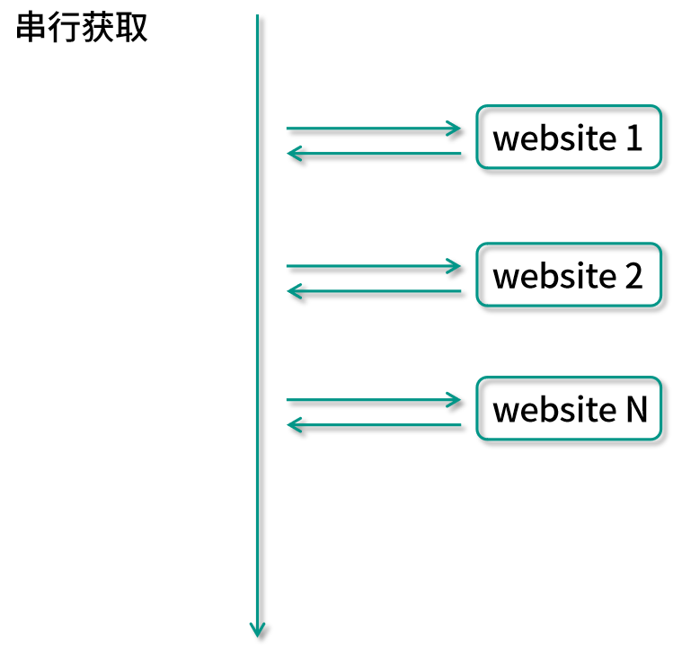 比如我们想获取价格,要先去访问国航,在这里叫作 website 1,然后再去访问海航 website 2,以此类推。当每一个请求发出去之后,等它响应回来以后,我们才能去请求下一个网站,这就是串行的方式。