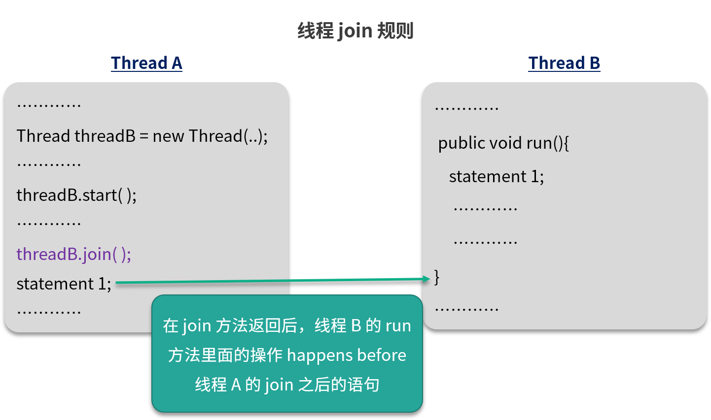 我们知道 join 可以让线程之间等待,假设线程 A 通过调用 threadB.start() 启动了一个新线程 B,然后调用 threadB.join() ,那么线程 A 将一直等待到线程 B 的 run 方法结束(不考虑中断等特殊情况),然后 join 方法才返回。在 join 方法返回后,线程 A 中的所有后续操作都可以看到线程 B 的 run 方法中执行的所有操作的结果,也就是线程 B 的 run 方法里面的操作 happens-before 线程 A 的 join 之后的语句。如下图所示:
