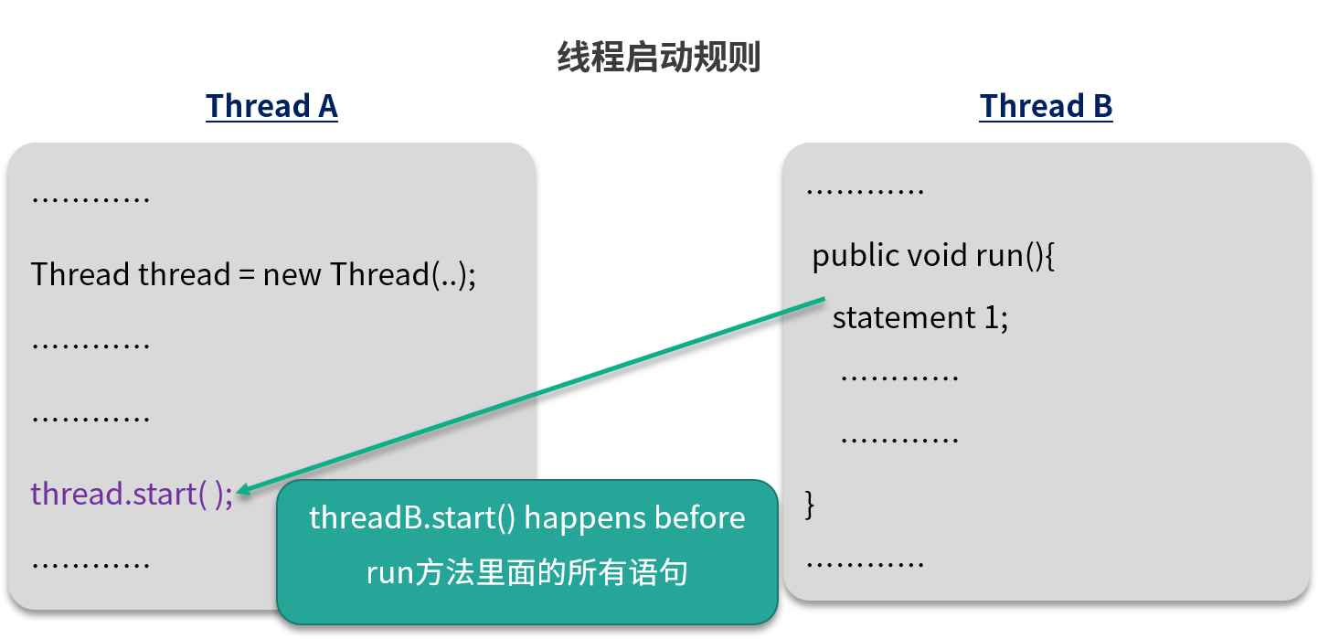 这就代表了如果变量被 volatile 修饰,那么每次修改之后,其他线程在读取这个变量的时候一定能读取到该变量最新的值。我们之前介绍过 volatile 关键字,知道它能保证可见性,而这正是由本条规则所规定的。(4)线程启动规则 : Thread 对象的 start 方法 happen-before 此线程 run 方法中的每一个操作。如下图所示: