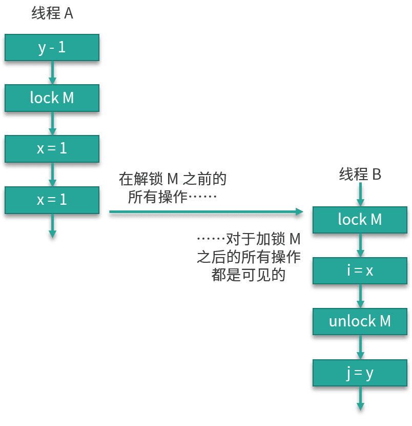 答案是否定的。其实只要重排序后的结果依然符合 happens-before 关系,也就是能保证可见性的话,那么就不会因此限制重排序的发生。比如,单线程内,语句 1 在语句 2 的前面,所以根据“单线程规则”,语句 1 happens-before 语句 2,但是并不是说语句 1 一定要在语句 2 之前被执行,例如语句 1 修改的是变量 a 的值,而语句 2 的内容和变量 a 无关,那么语句 1 和语句 2 依然有可能被重排序。当然,如果语句 1 修改的是变量 a,而语句 2 正好是去读取变量 a 的值,那么语句 1 就一定会在语句 2 之前执行了。(2)锁操作规则(synchronized 和 Lock 接口等) : 如果操作 A 是解锁,而操作 B 是对同一个锁的加锁,那么 hb(A, B) 。正如下图所示: