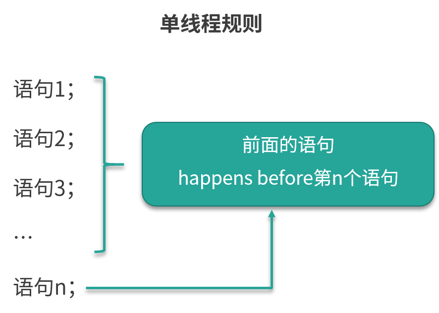 (1)单线程规则 : 在一个单独的线程中,按照程序代码的顺序,先执行的操作 happen-before 后执行的操作。也就是说,如果操作 x 和操作 y 是同一个线程内的两个操作,并且在代码里 x 先于 y 出现,那么有 hb(x, y),正如下图所示: