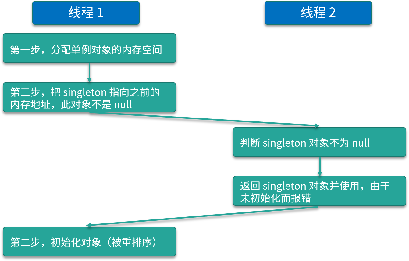 这时线程 2 进入 getInstance 方法,判断 singleton 对象不是 null,紧接着线程 2 就返回 singleton 对象并使用,由于没有初始化,所以报错了。最后,线程 1 “姗姗来迟”,才开始执行新建实例的第二步——初始化对象,可是这时的初始化已经晚了,因为前面已经报错了。