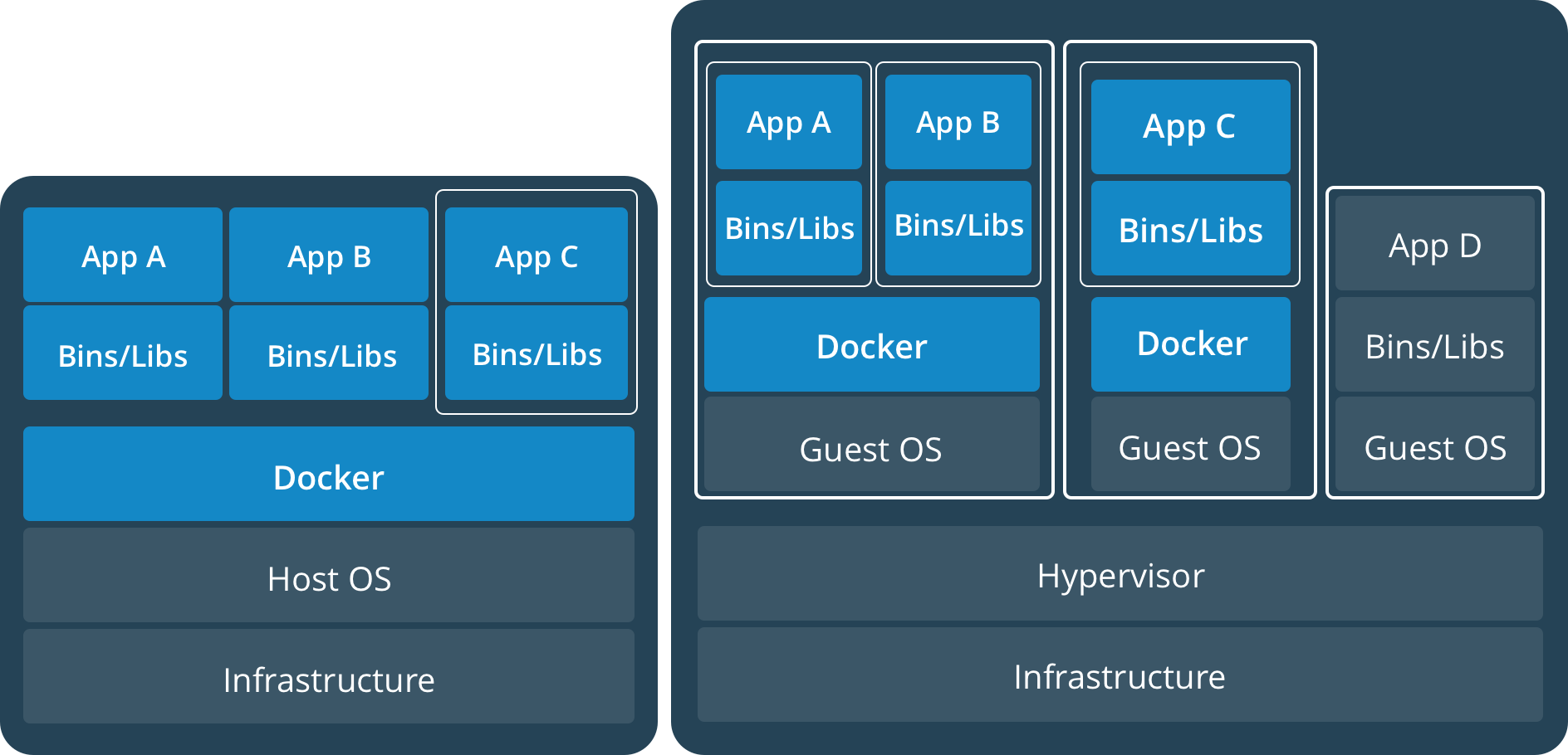 - 虚拟化手段的变化:云时代采用标配硬件来降低成本,采用虚拟化手段来满足用户按需分配的资源需求以及保证可用性和隔离性。然而无论是 KVM 还是 Xen,在 Docker 看来都在浪费资源,因为用户需要的是高效运行环境而非 OS,GuestOS 既浪费资源又难于管理,轻量级的 LXC 更加灵活和快速。如图所示:
