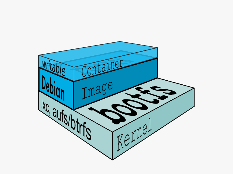 典型的 Linux 在启动后,首先将 rootfs 设置为 readonly,进行一系列检查,然后将其切换为 “readwrite”供用户使用。在 Docker 中,初始化时也是将 rootfs 以 readonly 方式加载并检查,然而接下来利用 union mount 的方式将一个 readwrite 文件系统挂载在 readonly 的 rootfs 之上,并且允许再次将下层的 FS(file system)设定为 readonly,并且向上叠加,这样一组 readonly 和一个 writeable 的结构构成一个 container 的运行时态,每一个 FS 被称作一个 FS 层。如下图: