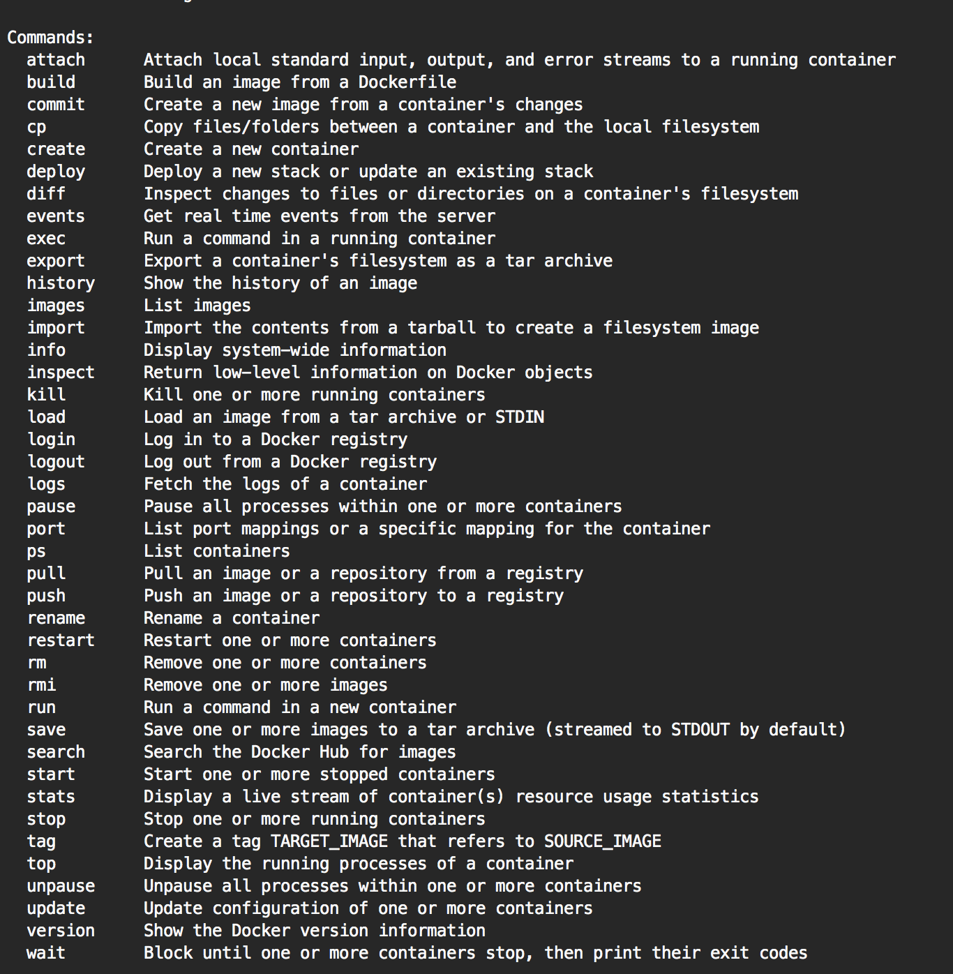 1. attach 2. build 3. commit 4. cp 5. diff 6. images 7. export/ import / save / load 8. inspect 9. kill 10. port 11. pause / unpause 12. ps 13. rm 14. rmi 15. run 16. start / stop / restart 17. tag 18. top 19.wait 20. rename 21.stats 22. update 23. exec 24.deploy 25.create