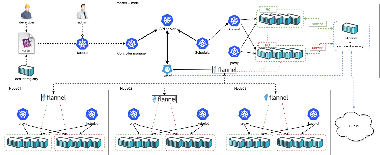 - The Kubernetes Node,计算节点,通过自维护的策略来保证主机上服务的可用性,当集群控制面板发布指令后,也是异步通过 etcd 来存储和发布指令,没有集群控制链路层面的依赖。
