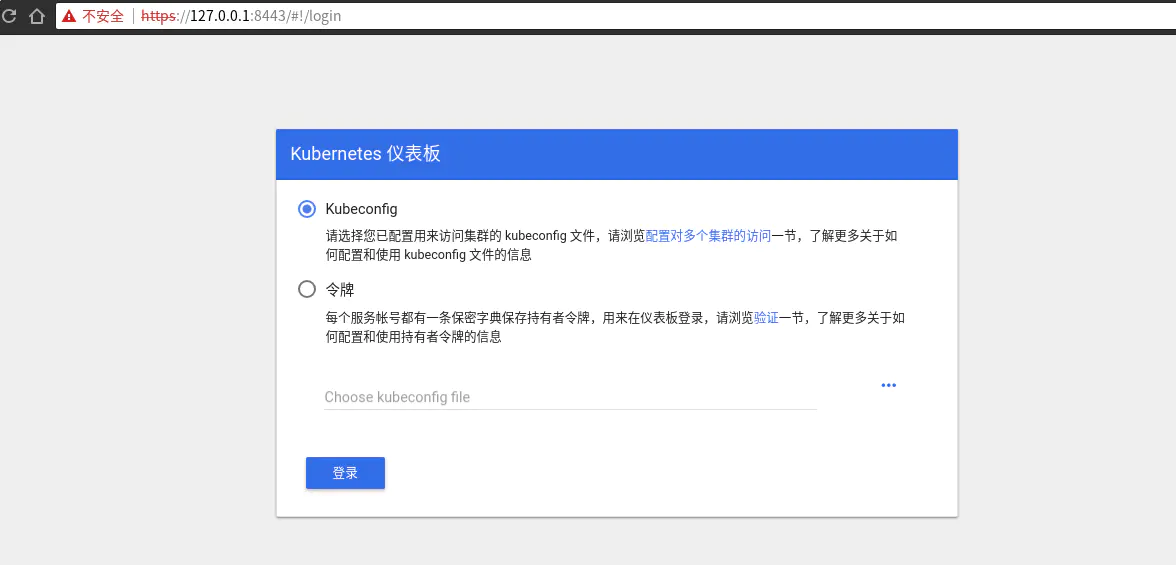 现在在浏览器打开 https://127.0.0.1:8443 便可看到如下的登录界面。