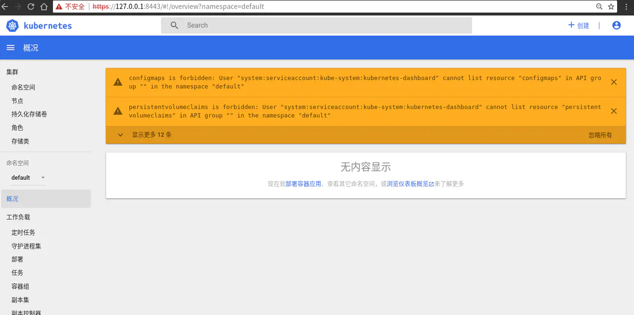 但是我们注意到这里有很多提示 configmaps is forbidden: User "system:serviceaccount:kube-system:kubernetes-dashboard" cannot list resource "configmaps" in API group "" in the namespace "default" 。根据我们前面的介绍,这很明显就是用户权限不足。