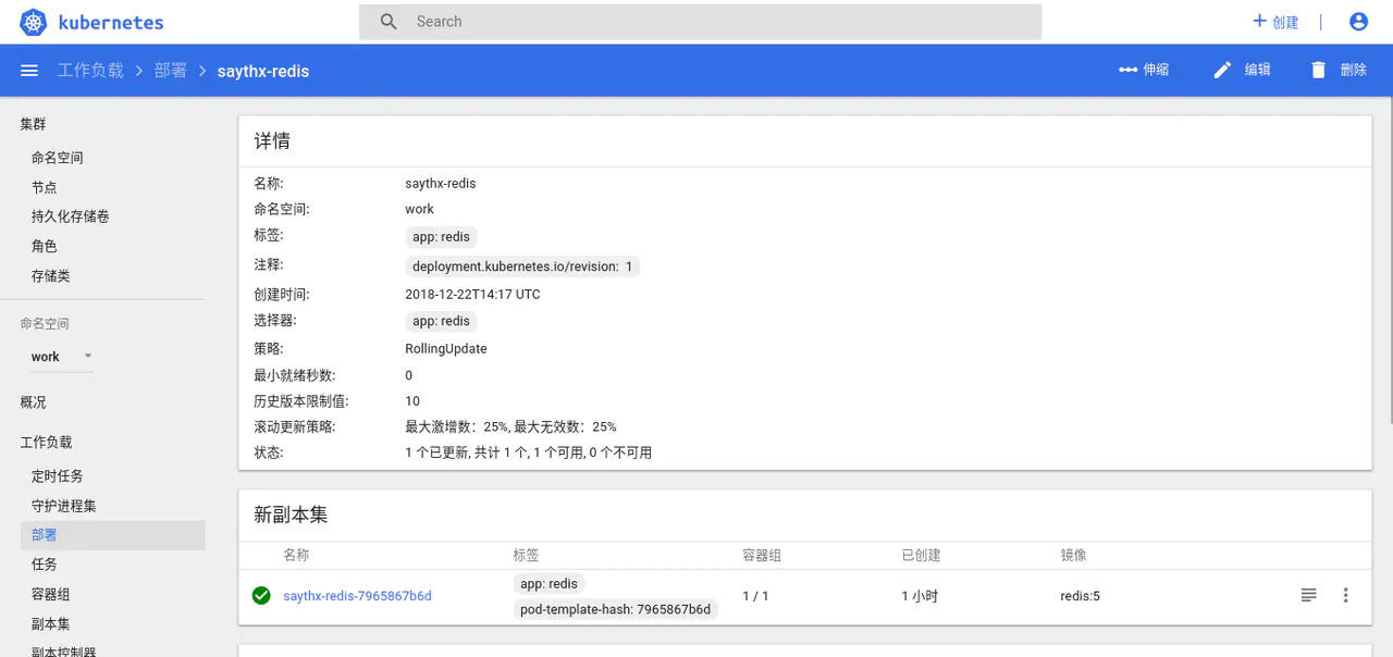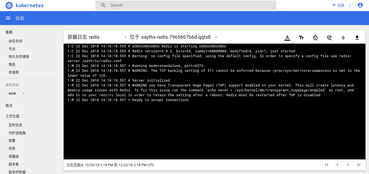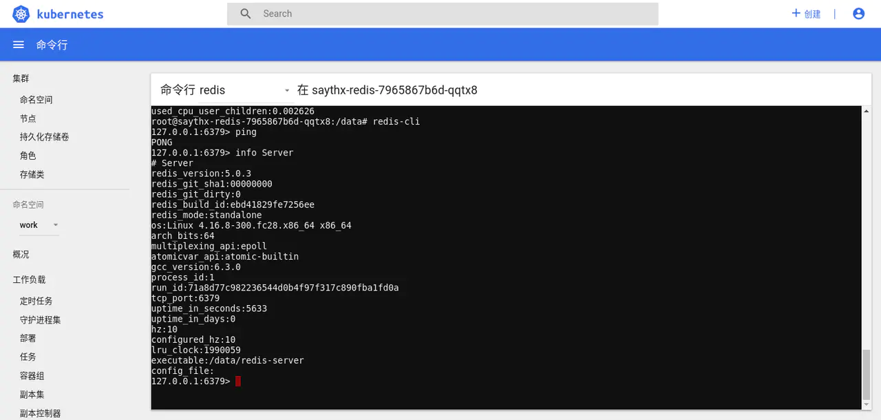 我们先将左侧的命名空间选择为 全部命名空间 或 work (当刷新过网页后) ,接下来继续点击右上角的 +创建 按钮,将 redis-deployment.yaml 的内容复制进输入框,点击上传按钮,部署 Redis 。