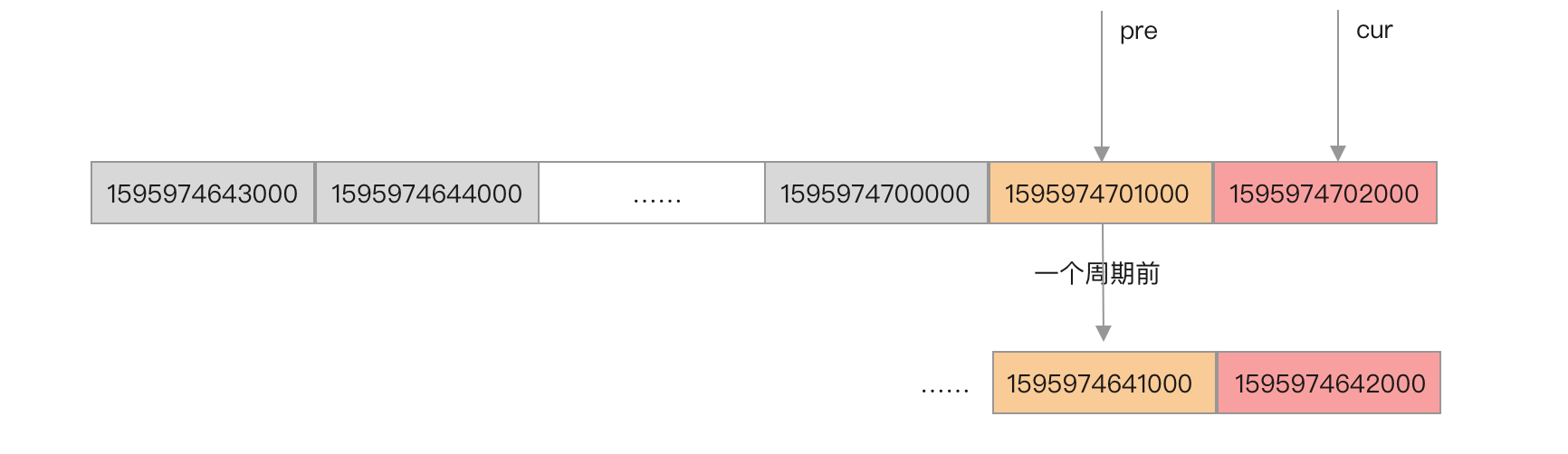 当前时间戳对应的 Bucket 的时间窗口开始时间戳为 1595974702000,而前一个 Bucket 的时间窗口开始时间戳可能是 1595974701000,也可能是一个滑动窗口周期之前的 1595974641000。所以,在获取到当前 Bucket 的前一个 Bucket 时,需要根据 Bucket 的时间窗口开始时间与当前时间戳比较,如果跨了一个周期就是无效的。
