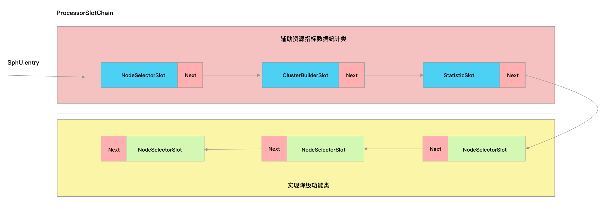 Sentinel 的整体工具流程就是使用责任链模式将所有的 ProcessorSlot 按照一定的顺序串成一个单向链表。辅助完成资源指标数据统计的 ProcessorSlot 必须在实现降级功能的 ProcessorSlot 的前面,原因很简单,降级功能需要依据资源的指标数据做判断,当然,如果某个 ProcessorSlot 不依赖指标数据实现降级功能,那这个 ProcessorSlot 的位置就没有约束。