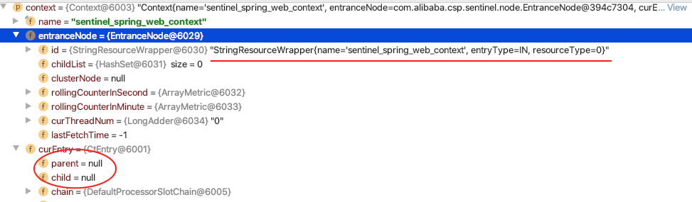 从上图中可以看出,此时的 Context.entranceNode 的子节点为空(childList 的大小为 0),并且当前 CtEntry 父、子节点都是 Null(curEntry 字段)。当绑定调用树这一行代码执行完成后,Context 的字段信息如下图所示: