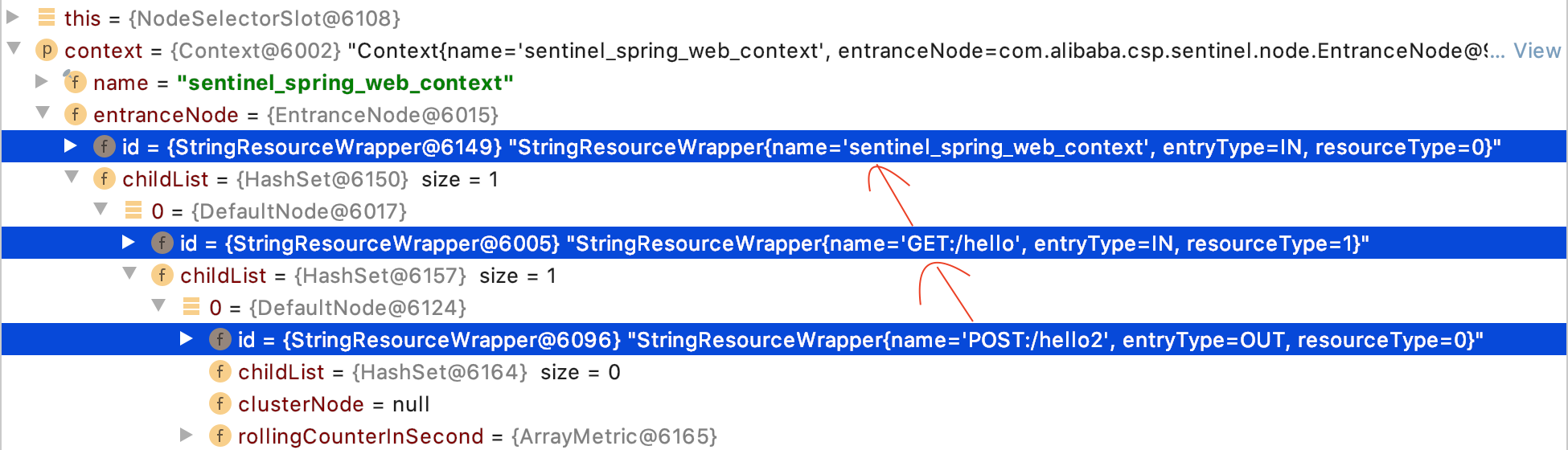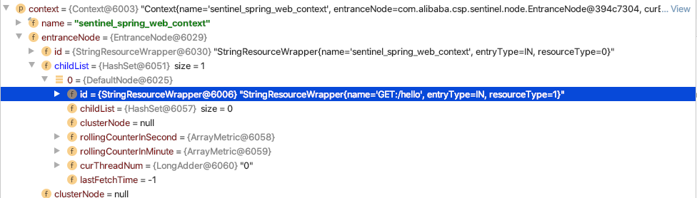 现在启动 demo,使用浏览器访问“/hello”接口。当代码执行到 apiHello 方法时,在 NodeSelectorSlot#entry 方法的绑定调用树这一行代码下断点。当绑定调用树这行代码执行完成后,Context 的字段信息如下图所示。