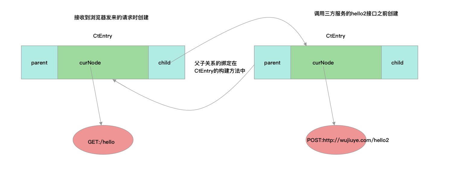 替换 Context.curNode 为当前资源 DefaultNode 这行代码就是将当前创建的 DefaultNode 赋值给当前 CtEntry.curNode。对着上图理解就是,将资源“GET:/hello”的 DefaultNode 赋值给第一个 CtEntry.curNode,将资源“POST:http://wujiuye.com/hello2%E2%80%9D%E7%9A%84 DefaultNode 赋值给第二个 CtEntry.curNode。