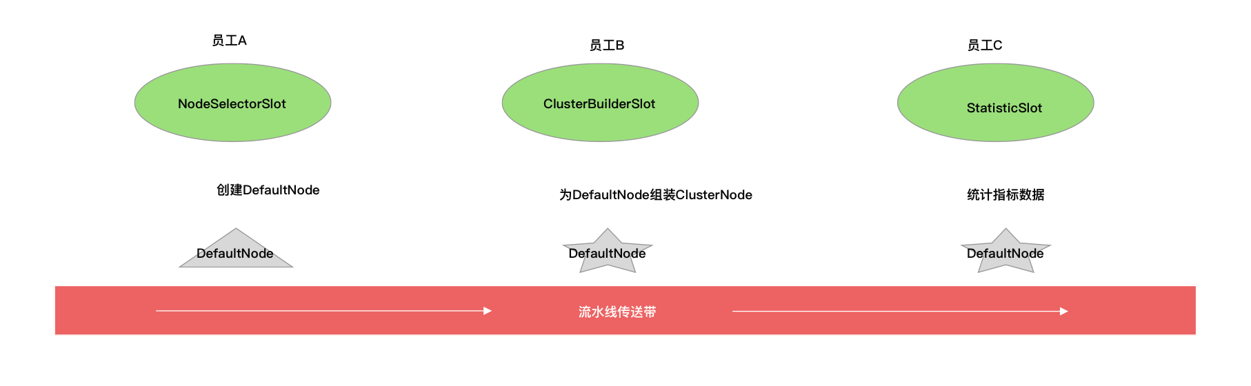 首先 NodeSelectorSlot 为资源创建 DefaultNode,将 DefaultNode 向下传递,ClusterBuilderSlot 负责给资源的 DefaultNode 加工,添加 ClusterNode 这个零部件,再将 DefaultNode 向下传递给 StatisticSlot,如下图所示: