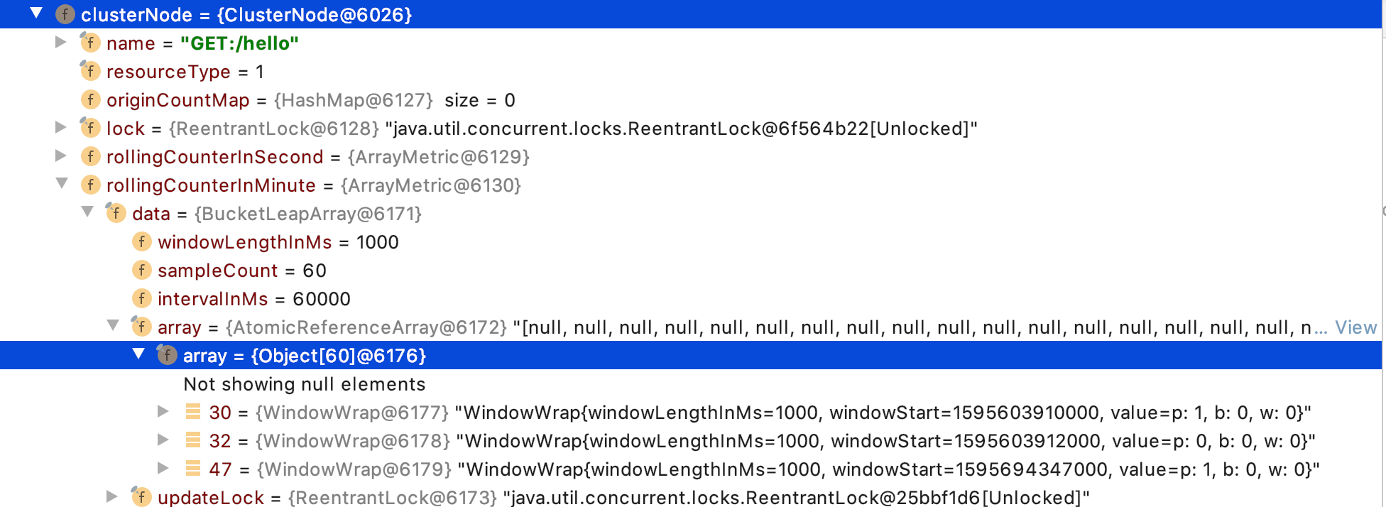 rollingCounterInSecond 是一个秒级的滑动窗口,rollingCounterInMinute 是一个分钟级的滑动窗口,类型为 ArrayMetric。分钟级的滑动窗口一共有 60 个 MetricBucket,每个 MetricBucket 都被 WindowWrap 包装,每个 MetricBucket 统计一秒钟内的各项指标数据,如下图所示: