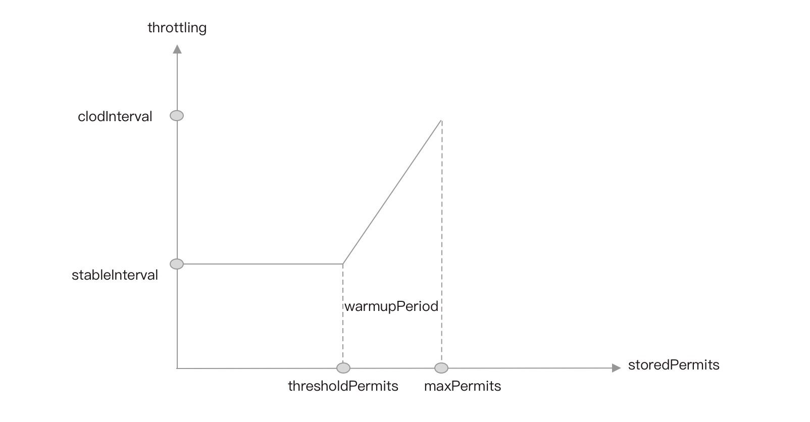 - warningToken:等同于 thresholdPermits,稳定的令牌生产速率下令牌桶中存储的令牌数。