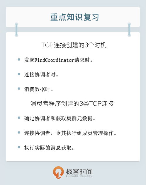 好了,今天我们补齐了 Kafka Java 客户端管理 TCP 连接的“拼图”。我们不仅详细描述了 Java 消费者是怎么创建和关闭 TCP 连接的,还对目前的设计方案提出了一些自己的思考。希望今后你能将这些知识应用到自己的业务场景中,并对实际生产环境中的 Socket 管理做到心中有数。