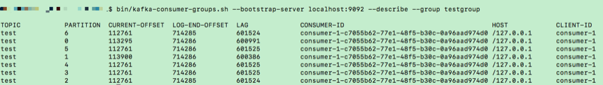 毫无疑问,在这些数据中,我们最关心的当属 LAG 列的值了,图中每个分区的 LAG 值大约都是 60 多万,这表明,在我的这个测试中,消费者组远远落后于生产者的进度。理想情况下,我们希望该列所有值都是 0,因为这才表明我的消费者完全没有任何滞后。