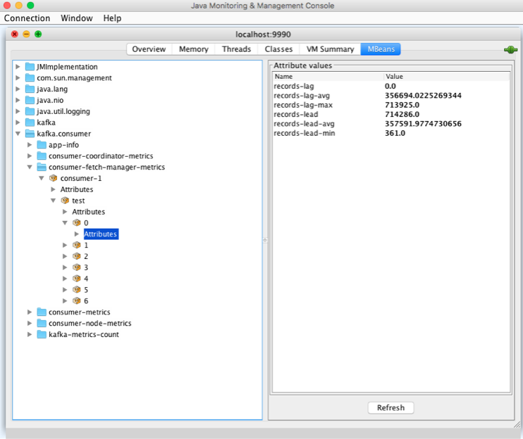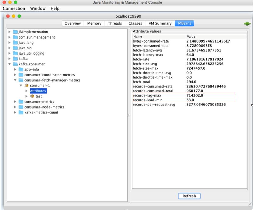 在我们的例子中,client-id 还是 consumer-1,主题和分区分别是 test 和 0。下图展示出了分区级别的 JMX 指标: