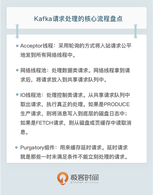 讲到这里,Kafka Broker 请求处理流程的解析应该讲得比较完整了。明确请求处理过程的最大意义在于,它是你日后执行 Kafka 性能优化的前提条件。如果你能从请求的维度去思考 Kafka 的工作原理,你会发现,优化 Kafka 并不是一件困难的事情。