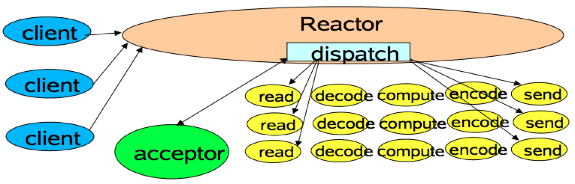 从这张图中,我们可以发现,多个客户端会发送请求给到 Reactor。Reactor 有个请求分发线程 Dispatcher,也就是图中的 Acceptor,它会将不同的请求下发到多个工作线程中处理。