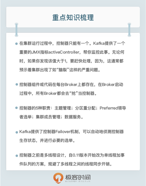 好了,有关 Kafka 控制器的内容,我已经讲完了。最后,我再跟你分享一个小窍门。当你觉得控制器组件出现问题时,比如主题无法删除了,或者重分区 hang 住了,你不用重启 Kafka Broker 或控制器。有一个简单快速的方式是,去 ZooKeeper 中手动删除 /controller 节点。具体命令是 rmr /controller 。这样做的好处是,既可以引发控制器的重选举,又可以避免重启 Broker 导致的消息处理中断。