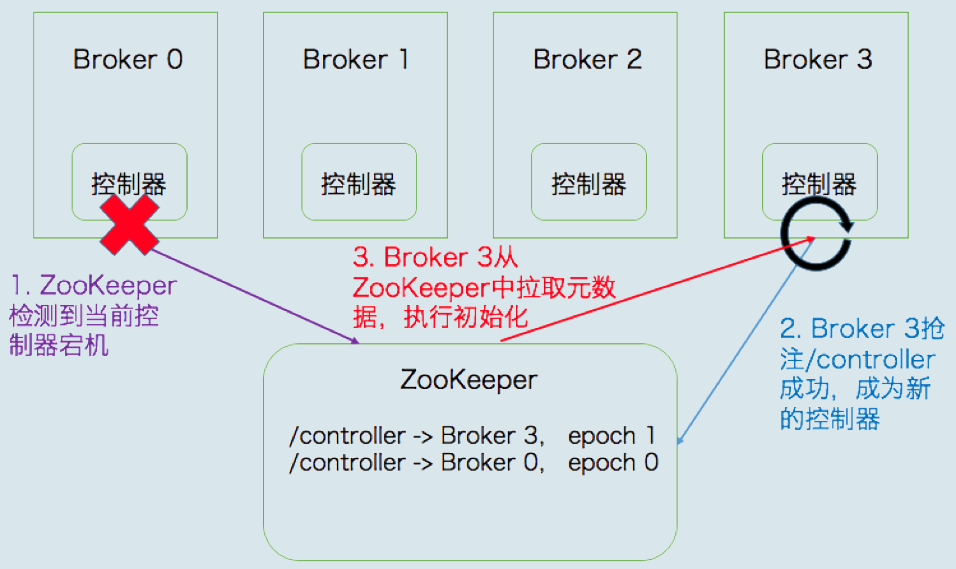 最开始时,Broker 0 是控制器。当 Broker 0 宕机后,ZooKeeper 通过 Watch 机制感知到并删除了 /controller 临时节点。之后,所有存活的 Broker 开始竞选新的控制器身份。Broker 3 最终赢得了选举,成功地在 ZooKeeper 上重建了 /controller 节点。之后,Broker 3 会从 ZooKeeper 中读取集群元数据信息,并初始化到自己的缓存中。至此,控制器的 Failover 完成,可以行使正常的工作职责了。