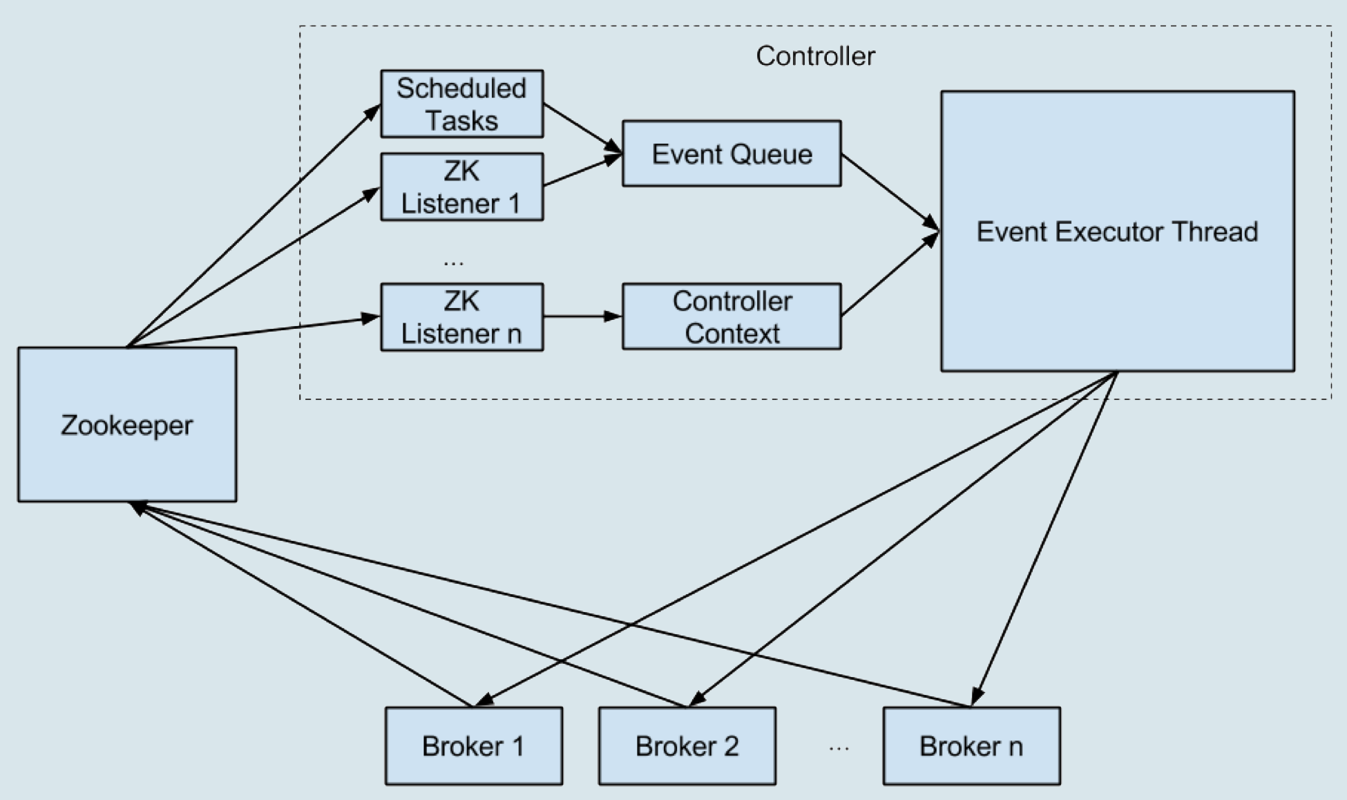 鉴于这些原因,社区于 0.11 版本重构了控制器的底层设计,最大的改进就是,把多线程的方案改成了单线程加事件队列的方案 。我直接使用社区的一张图来说明。