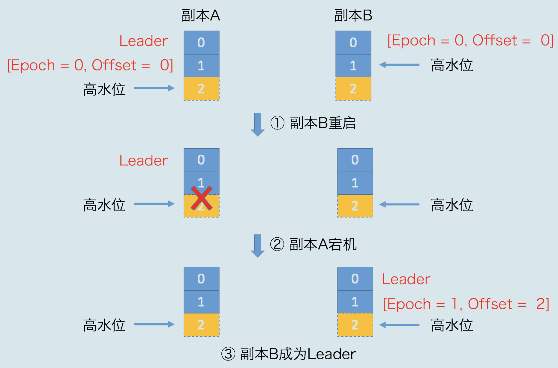 现在,副本 A 宕机了,B 成为 Leader。同样地,当 A 重启回来后,执行与 B 相同的逻辑判断,发现也不用执行日志截断,至此位移值为 1 的那条消息在两个副本中均得到保留。后面当生产者程序向 B 写入新消息时,副本 B 所在的 Broker 缓存中,会生成新的 Leader Epoch 条目:[Epoch=1, Offset=2]。之后,副本 B 会使用这个条目帮助判断后续是否执行日志截断操作。这样,通过 Leader Epoch 机制,Kafka 完美地规避了这种数据丢失场景。