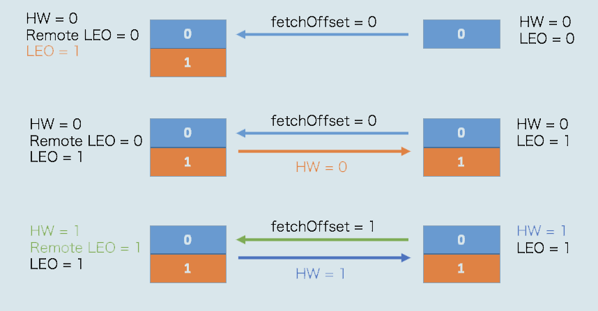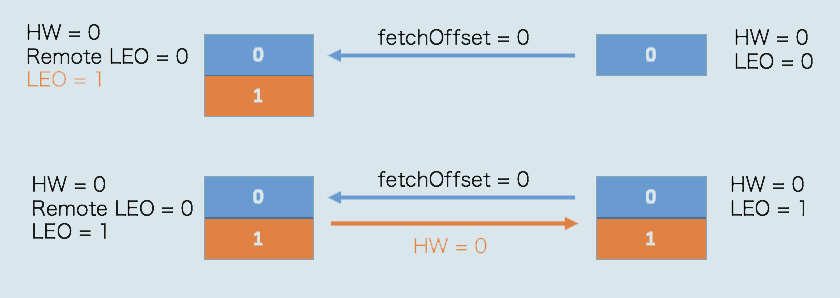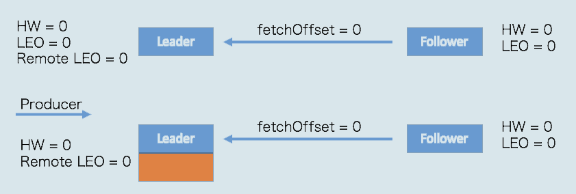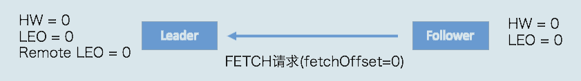 首先是初始状态。下面这张图中的 remote LEO 就是刚才的远程副本的 LEO 值。在初始状态时,所有值都是 0。