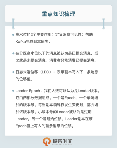 今天,我向你详细地介绍了 Kafka 的高水位机制以及 Leader Epoch 机制。高水位在界定 Kafka 消息对外可见性以及实现副本机制等方面起到了非常重要的作用,但其设计上的缺陷给 Kafka 留下了很多数据丢失或数据不一致的潜在风险。为此,社区引入了 Leader Epoch 机制,尝试规避掉这类风险。事实证明,它的效果不错,在 0.11 版本之后,关于副本数据不一致性方面的 Bug 的确减少了很多。如果你想深入学习 Kafka 的内部原理,今天的这些内容是非常值得你好好琢磨并熟练掌握的。