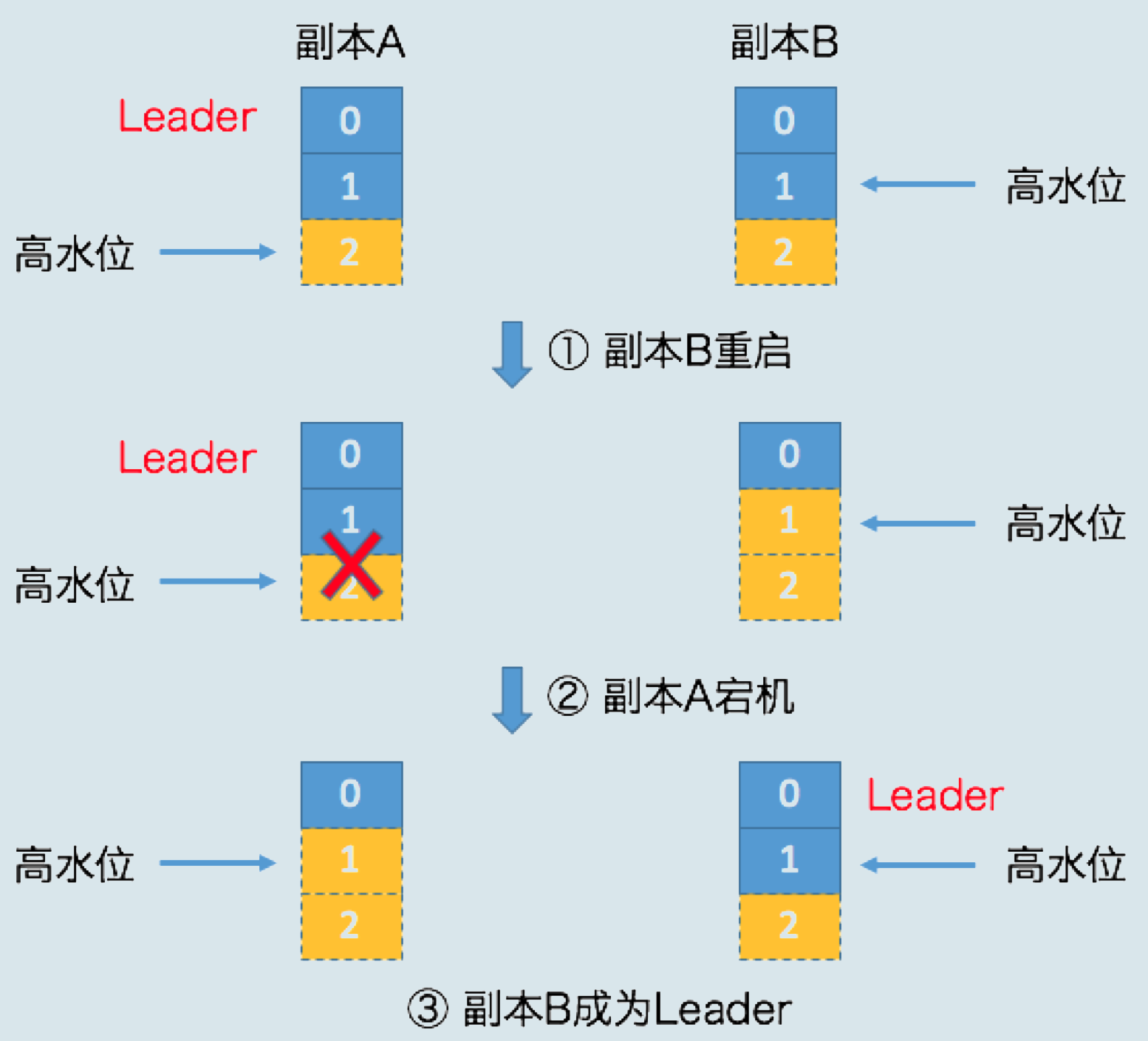 当执行完截断操作后,副本 B 开始从 A 拉取消息,执行正常的消息同步。如果就在这个节骨眼上,副本 A 所在的 Broker 宕机了,那么 Kafka 就别无选择,只能让副本 B 成为新的 Leader,此时,当 A 回来后,需要执行相同的日志截断操作,即将高水位调整为与 B 相同的值,也就是 1。这样操作之后,位移值为 1 的那条消息就从这两个副本中被永远地抹掉了。这就是这张图要展示的数据丢失场景。