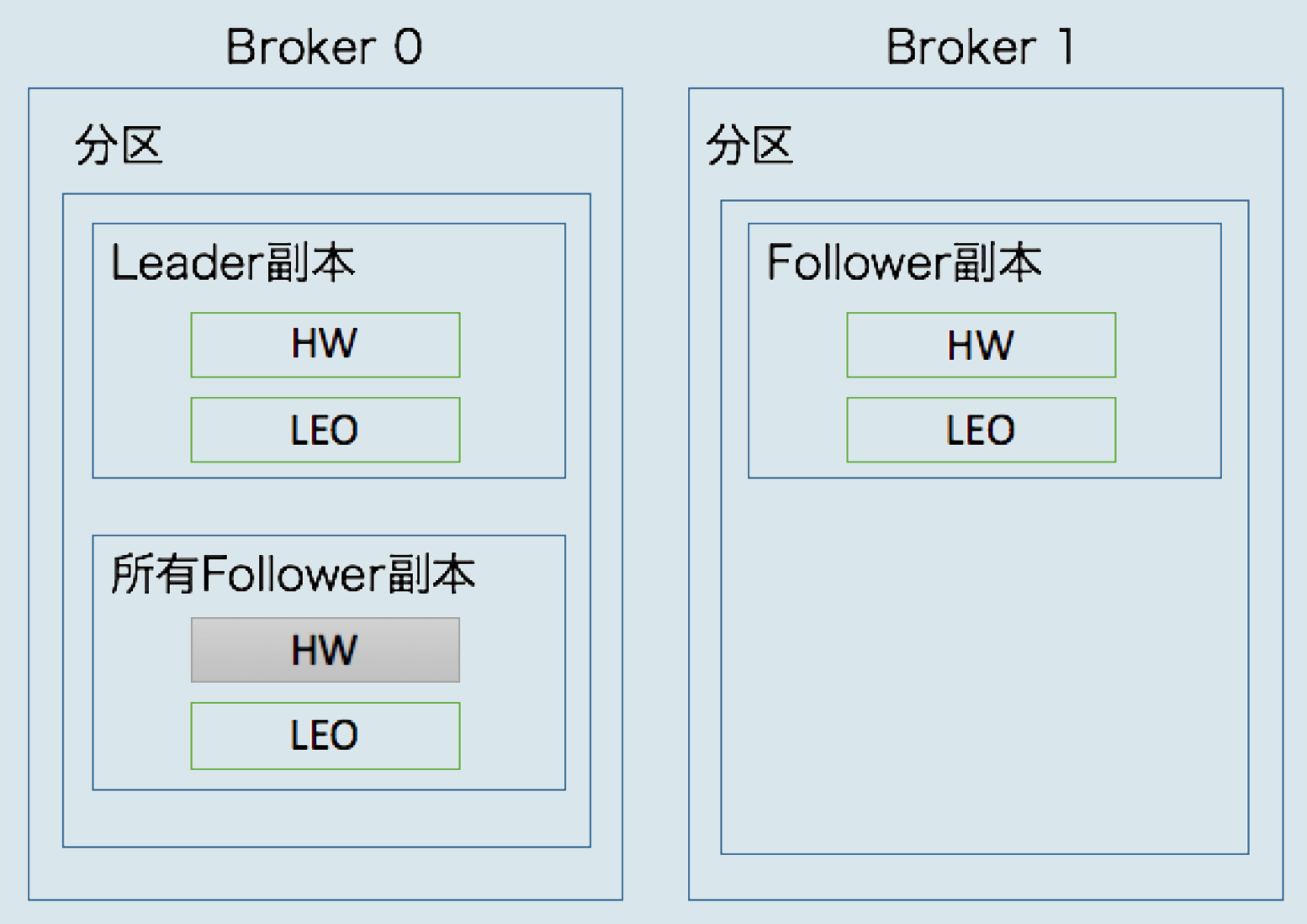 这时,Follower 副本也成功地更新 LEO 为 1。此时,Leader 和 Follower 副本的 LEO 都是 1,但各自的高水位依然是 0,还没有被更新。它们需要在下一轮的拉取中被更新,如下图所示:
