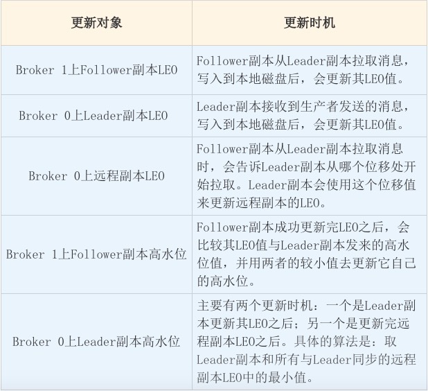 为了帮助你更好地记忆这些值被更新的时机,我做了一张表格。只有搞清楚了更新机制,我们才能开始讨论 Kafka 副本机制的原理,以及它是如何使用高水位来执行副本消息同步的。