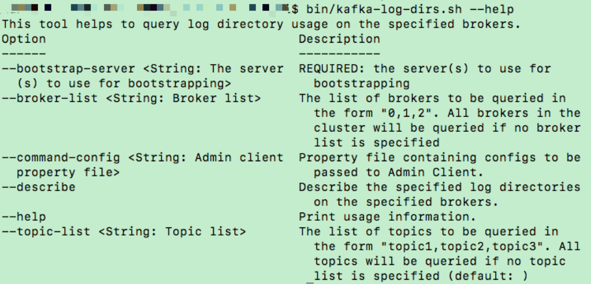 默认情况下,不加任何参数或携带 --help 运行 SHELL 文件,会得到该脚本的使用方法说明。下面这张图片展示了 kafka-log-dirs 脚本的调用方法。
