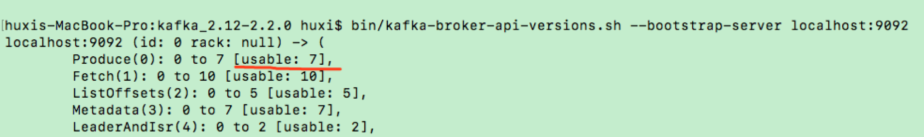 “Produce”表示 Produce 请求,生产者生产消息本质上就是向 Broker 端发送 Produce 请求。该请求是 Kafka 所有请求类型中的第一号请求,因此序号是 0。后面的“0 to 7”表示 Produce 请求在 Kafka 2.2 中总共有 8 个版本,序号分别是 0 到 7。“usable:7”表示当前连入这个 Broker 的客户端 API 能够使用的版本号是 7,即最新的版本。