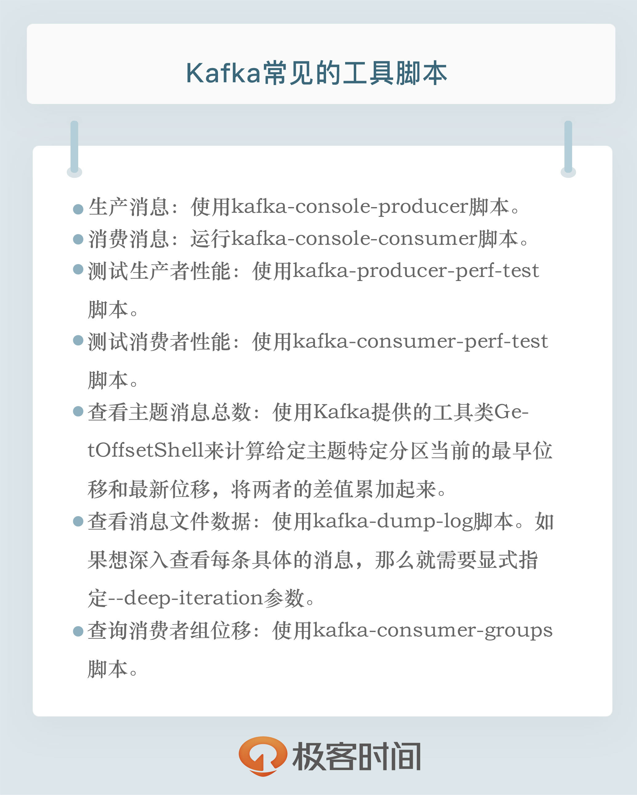 好了,我们小结一下。今天我们一起梳理了 Kafka 2.2 版本自带的所有脚本,我给出了常见的运维操作的工具行命令。希望这些命令对你操作和管理 Kafka 集群有所帮助。另外,我想强调的是,由于 Kafka 依然在不断演进,我们今天提到的命令的用法很可能会随着版本的变迁而发生变化。在具体使用这些命令时,你最好详细地阅读一下它们的 Usage 说明。