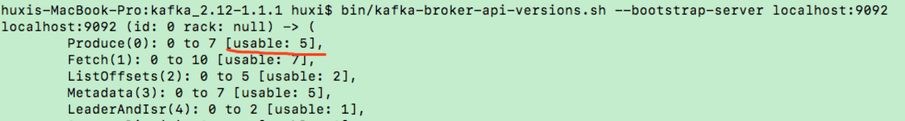 请注意这两张图中红线部分的差异。在第一张图中,我们使用 2.2 版本的脚本连接 2.2 版本的 Broker,usable 自然是 7,表示能使用最新版本。在第二张图中,我们使用 1.1 版本的脚本连接 2.2 版本的 Broker,usable 是 5,这表示 1.1 版本的客户端 API 只能发送版本号是 5 的 Produce 请求。