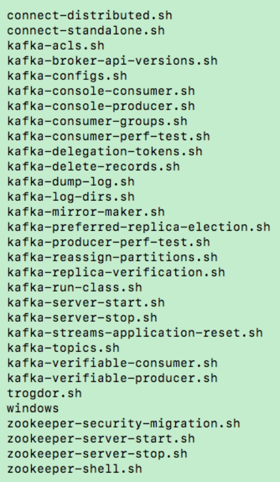 下面的两个脚本是重量级的工具行脚本:kafka-console-consumer 和 kafka-console-producer。在某种程度上,说它们是最常用的脚本也不为过。这里我们暂时先跳过,后面我会重点介绍它们。