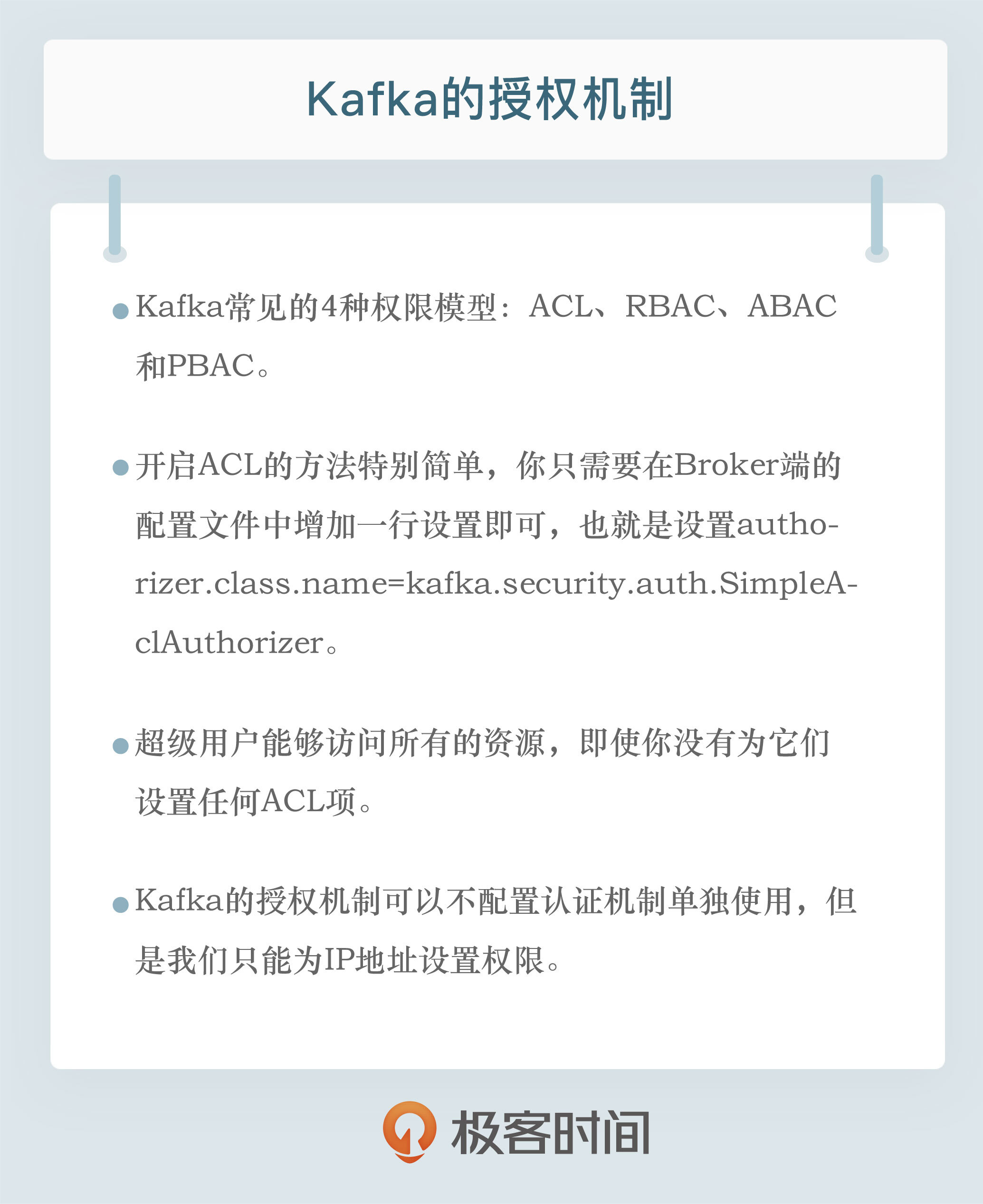 讲到这里,我们就完整地把 Kafka 授权机制梳理了一遍。除此之外,我还附赠了 SSL 端配置方法。希望你能将这两讲关于安全配置的内容结合起来学习,打造一个超级安全的 Kafka 集群。